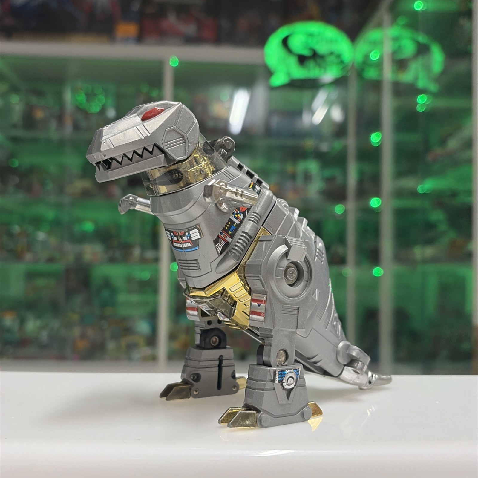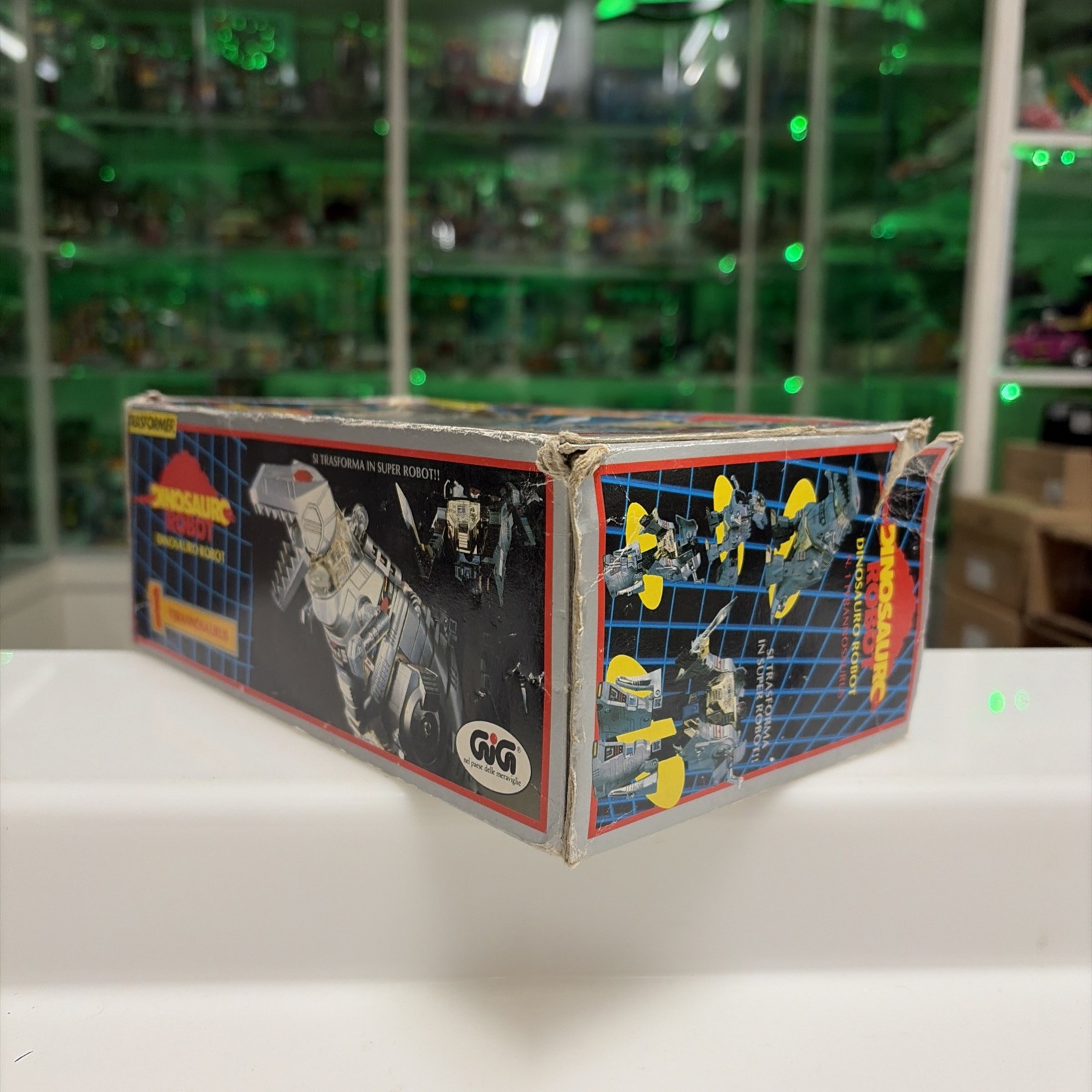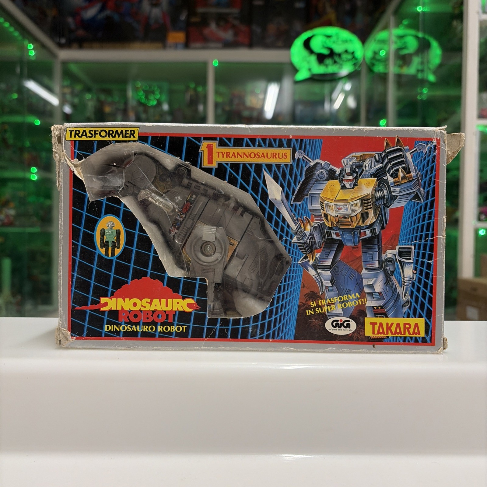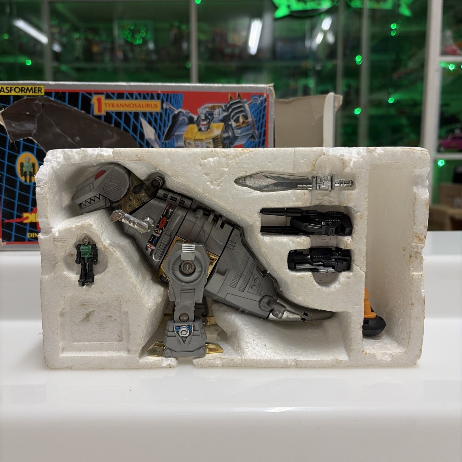 Oggetto in buone condizioni, giocato, completo di tutti gli accessori originali, perfettamente trasformabile . Presenta la rottura di uno dei due gancetti del collo del dino quando si chiude la testa, ma sta’ chiusa bene cmq . Il dianauta è mancante della parte calamitata e di uno dei due pernietti dove incastrano le calamite, la scatola esterna presenta svariati difetti, come da foto.